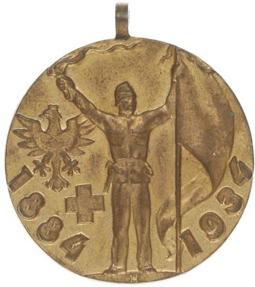 Opava - pamětní medaile k 50.výr. ZHJSL 1884 - 1934 - Slezský sjezd v Opavě, stojící hasič s praporem, znak, vročení Žlutý kov 35 mm, LKT.str.56_jednostr. orig.raž.ouško