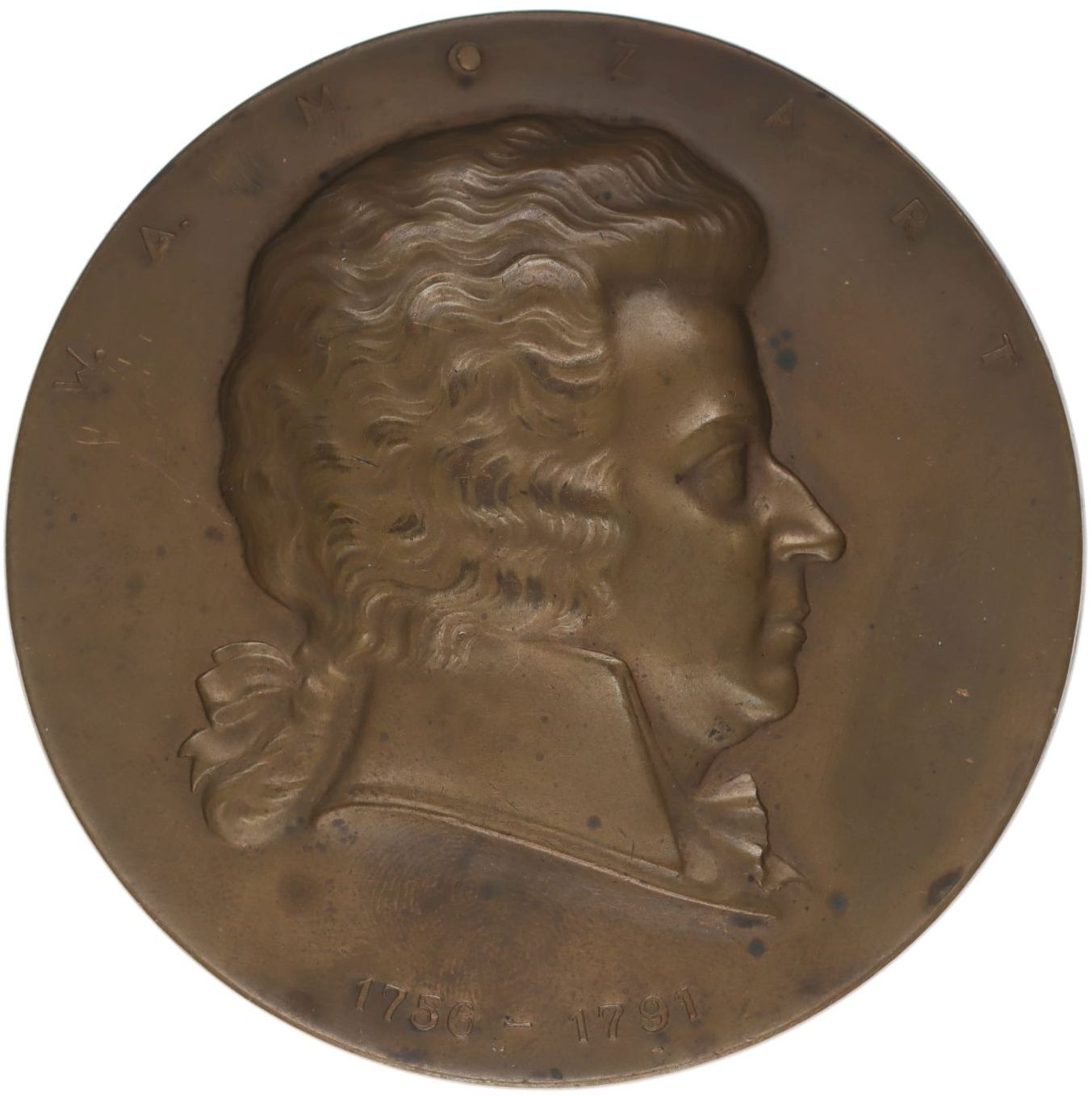 W.A.Mozart - na paměť 200.výr.narození 1756 - 1956 Potrét zprava, opis Sign.A.Hartig, Bronz 75 mm_jednostr.