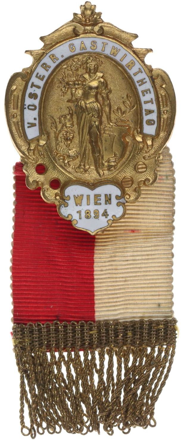 Vídeň - V. rakouské hostinské dny 1894 Stojící alegorická postava, opis, zlatobílý smalt 44x32 mm _připínací červenobílá stuha s třásněmi