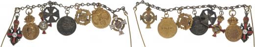 Miniatura Řádu Fr.Jos.I. - rytířský kříž, Signum laudis - bronz.med., Záslužný kříž zlatý s korunou, Karlův voj.kříž, Maďarská ,ed. na válku 1914-18, Jub.kříž z r.1908, Rak.pam.med. na válku s meči 1914-18 Bavor.vál.pam.kříž 1914-18_celk.8 ks na společném řetízku
