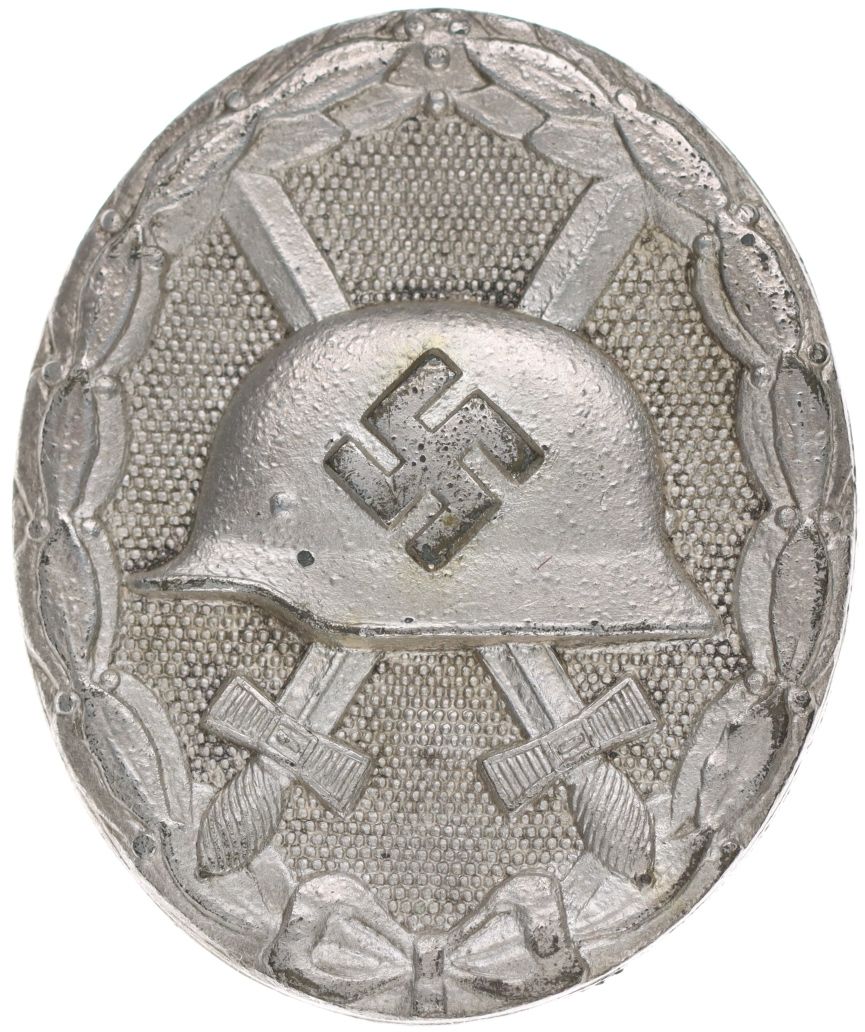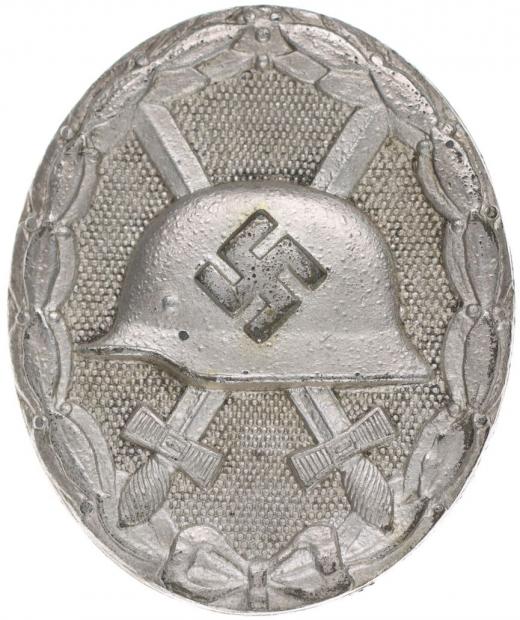 Odznak za zranění, helma se svastikou, zkříž.meče 45x38 mm, stříbřitý - Postř.Zn, 2.typ z l.1940-45, výr.L/13 Nim.3845, Har.44, Niem.7.04.13-2_se sponou