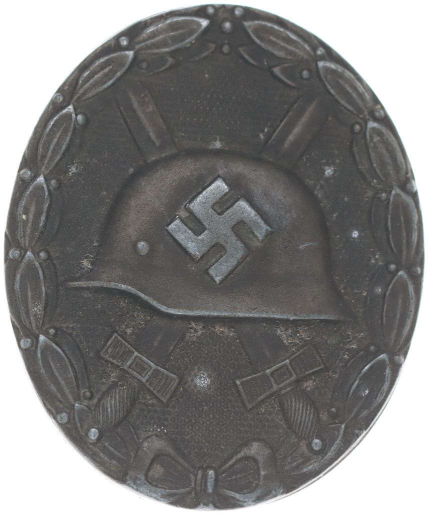 Odznak za zranění, helma se svastikou, zkříž.meče 45x38 mm, Masivní černé Zn, 2.typ z l.1940-45, výr.L22 Nim.3846, Niem.7.04.15-1, Hart.45_se sponou