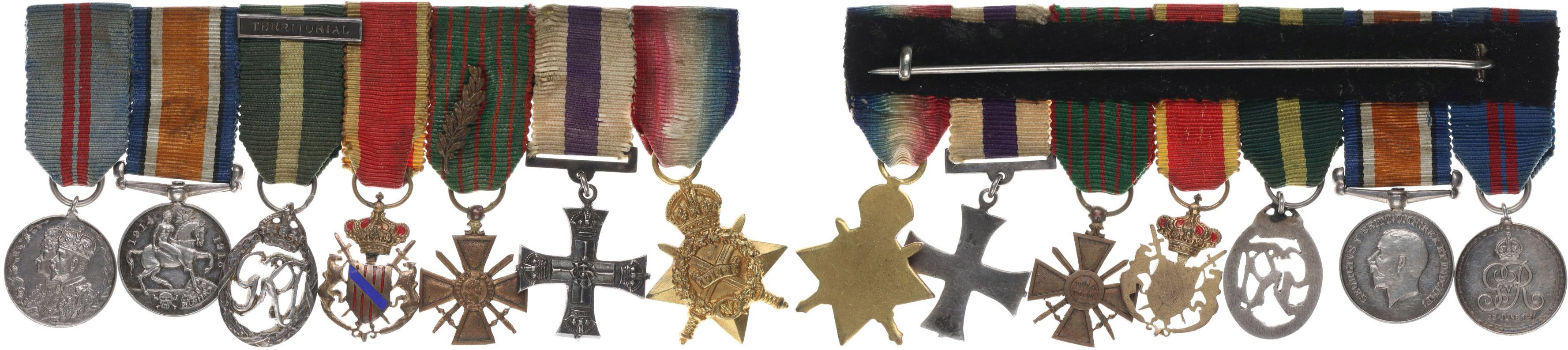 Miniatura - Korunov.med. George V. 1911, Válečná med. na válku 1914-18 Medaile na dlouholetou službu v ter.armádě, Medaile Baleárských ostrovům Franc.vál.kříž 1914-18, Britský voj.kříž 1914-18 _celk.7 ks na společném řetízku