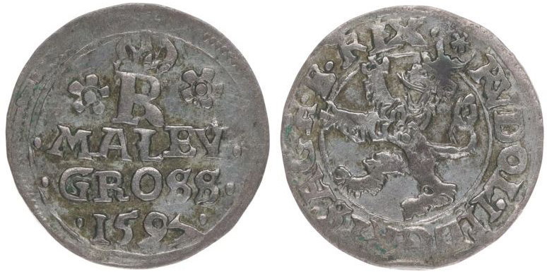 Malý groš 1597, Jáchymov-Hoffmann, HN.7a (opis 7c), jako Ja.4c var. tečka za REX_R!