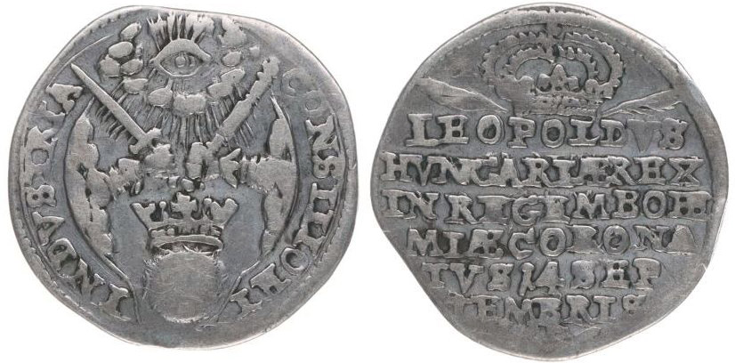 Malý žeton na korunovaci na českého krále v Praze 14.9.1656 7řádk.nápis pod korunou / pod božím okem drží dvě ruce žezlo a meč, Ag 17 mm, 1,41 g, Nov.IX/D-5b, Mo.-, Do.2459_R!