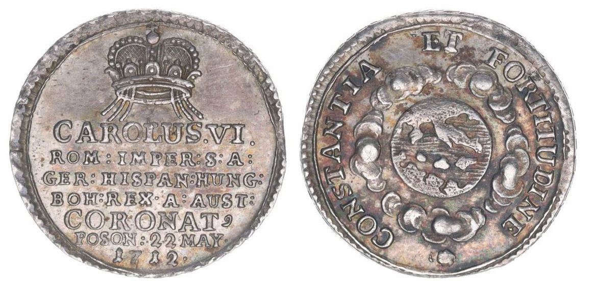 Menší peníz na korunovaci v Bratislavě, 22.5.1712 Koruna, 7řádk.nápis / zeměkoule v oblacích, opis, Nesign., Ag 19 mm, 1,92 g, Mo.-, Nov.XI/M-20b