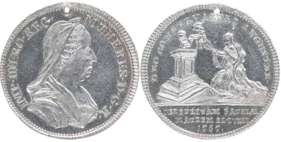 Menší peníz na uzdravení od neštovic, 1767 Portrét, opis / císařovna klečící před oltářem, opis. Ag 21 mm, 2.00 g, ČS.1368, Mo.1979_dírka
