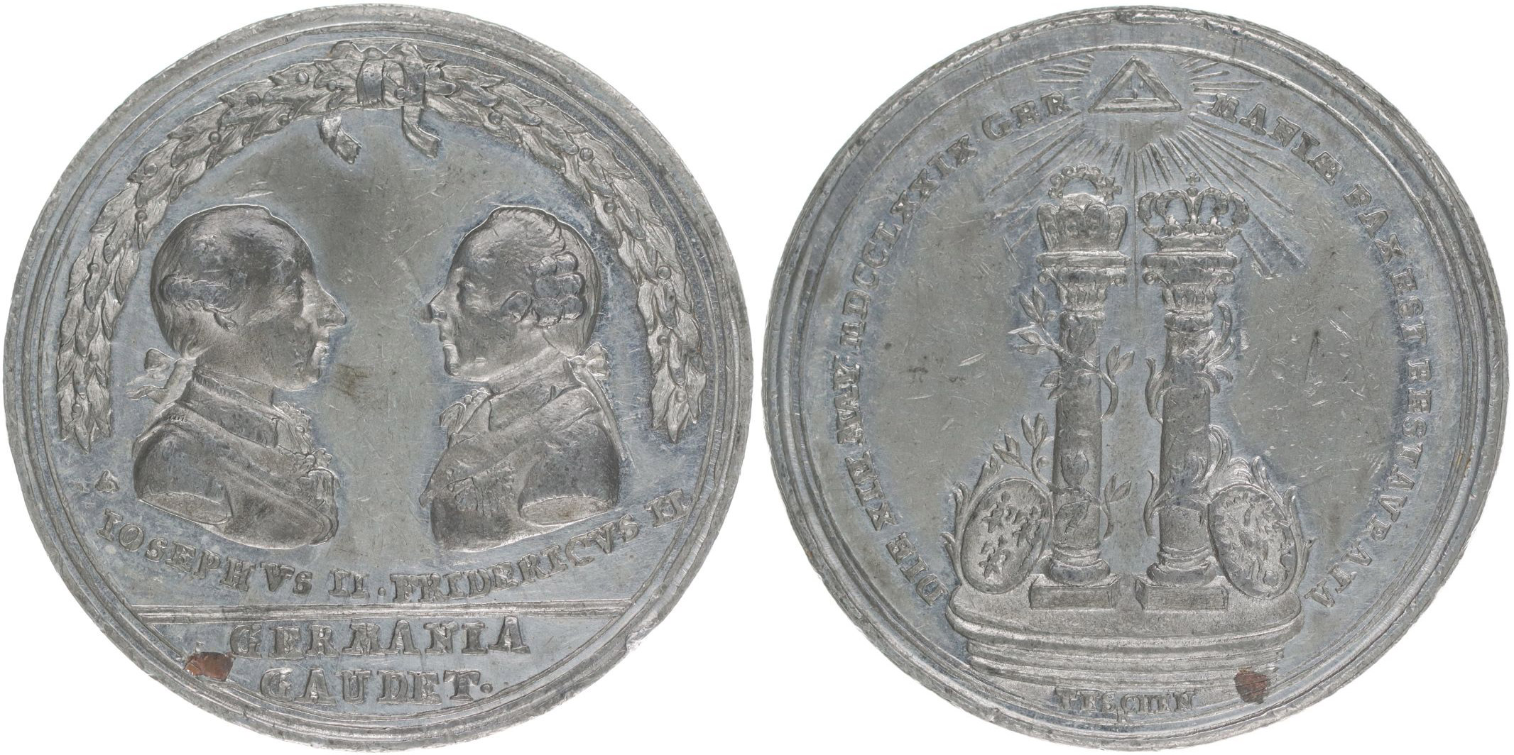 Nesign. - medaile na Těšínský mír 13.5.1779 Poprsí Josefa II. a Friedricha II. proti sobě, 2řádk.nápis, opis / dva sloupy ovinuté ratolestmi, opis, Sn 46 mm s Cu čepem, 28,31 g Fr.4491, Ho.3149, LG.XIV/295_R!