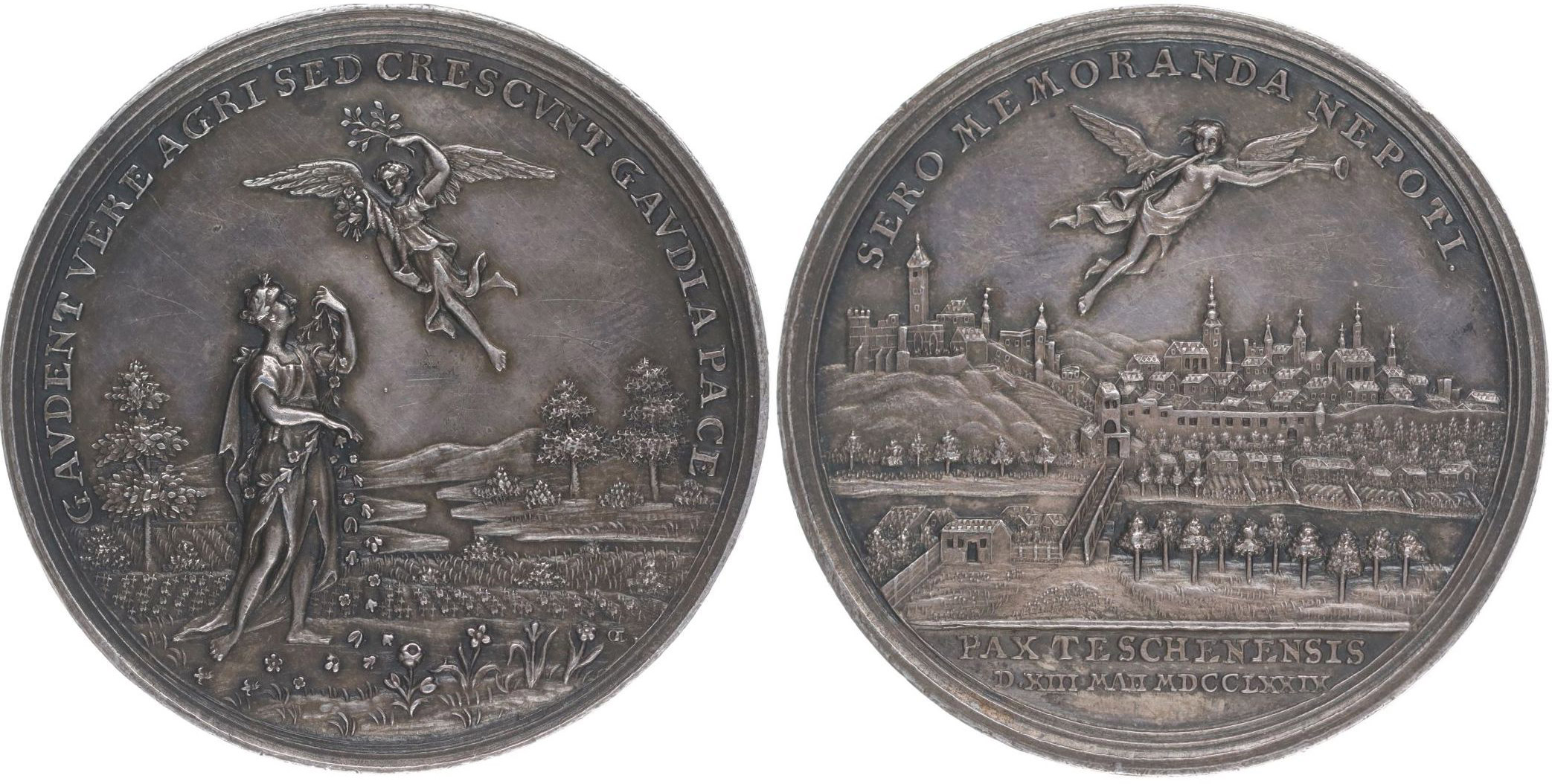 J.L.Oexlein - medaile na Těšínský mír 13.5.1779 Stojící ženská postava v krajině, nad ní anděl s rohem hojnosti, latinský opis / letící anděl nad městem, latinský opis, 2řádk.nápis v úseči, Ag 45 mm, 21,87 g, Fr.4489_R!