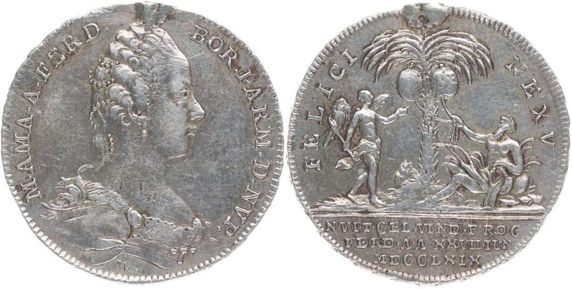 A.Wideman - na zasnoubení s Ferdinandem Bourbonským 27.6.1769, Portrét arcivévodkyně zprava, opis / 2 alegorické postavy pod stromem se znaky, Sign.A.W., Ag 25 mm, 3.86 g, Mo.1999 LG.XIV/238, Ho.3304, SD.215_st. po o.