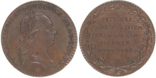 Větší peníz na holdování v Belgii (Brusel), 1794#Br Portrét zprava, opis / 5řádk.nápis ve věnci Bronz 28 mm, 7,27 g, Nov.XVII/M-4b_R!