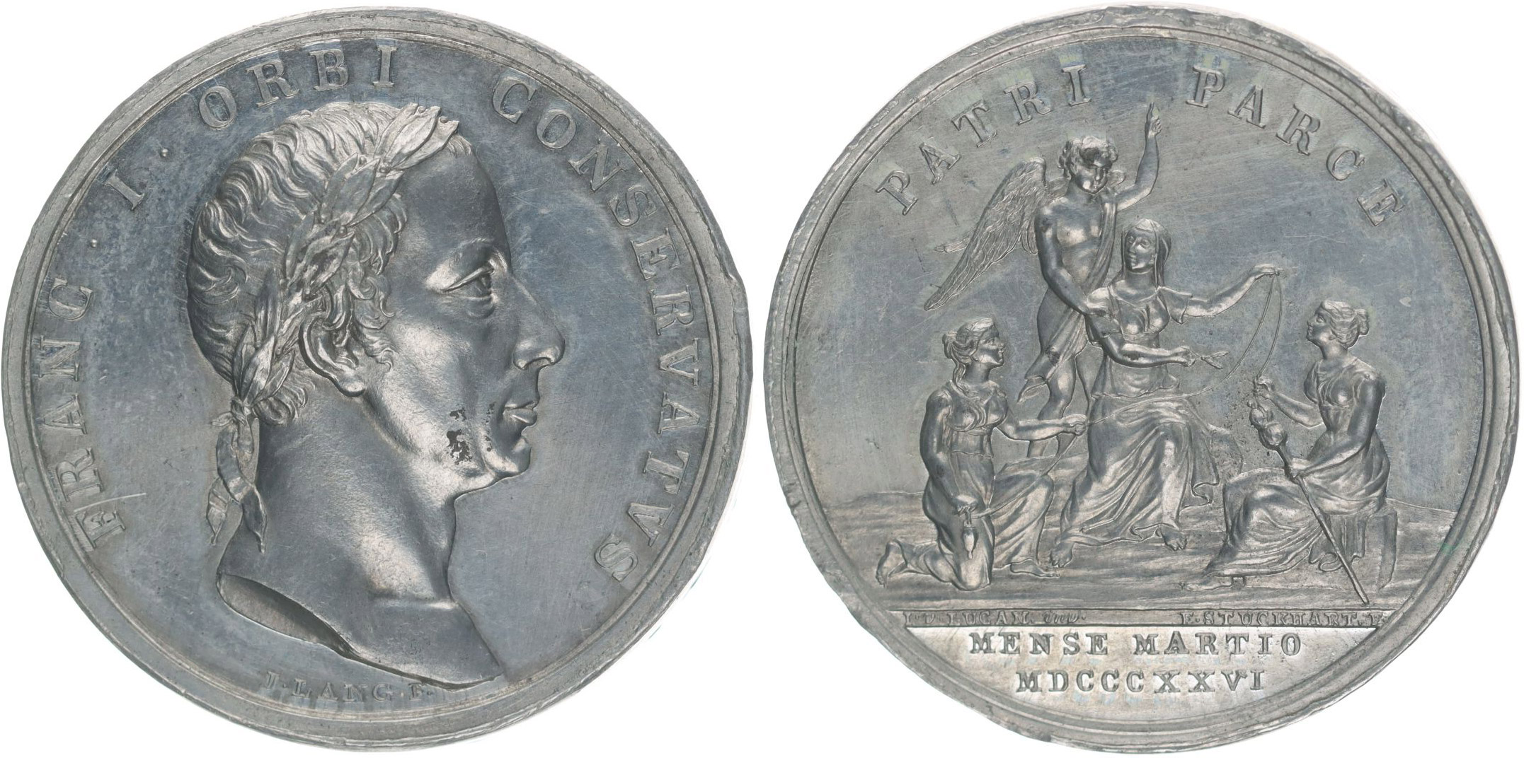 Lang a Stuckhart - medaile na uzdravení císaře, 1826 Poprsí zprava, opis / sudičky s nití života a anděl, písmo, Sn 37 mm, 19,08 g, Mo.2506 (Ag), Ho.3474(Ag)