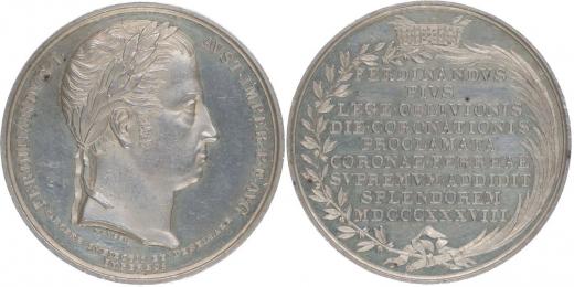 Neuss - medaile na korunovaci v Miláně 6.9.1838 Portrét zprava, opis / 9řádk.nápis ve věnci pod korunou Ag 33 mm, 13,58 g, Mo.2583, Nov.XVIII/G-5a, Ho.3638