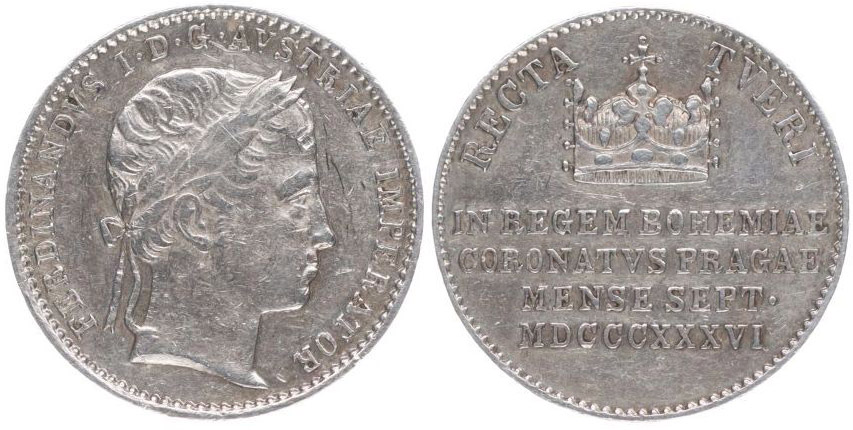 Menší peníz na korunovaci v Praze, 7.IX.1836 Portrét, opis / koruna, nápis, opis, Nesign. Ag 18 mm, 3.29 g, ČS.1494, P.3/24, M.2565, Nov.XVIII/D-4b