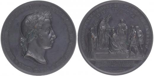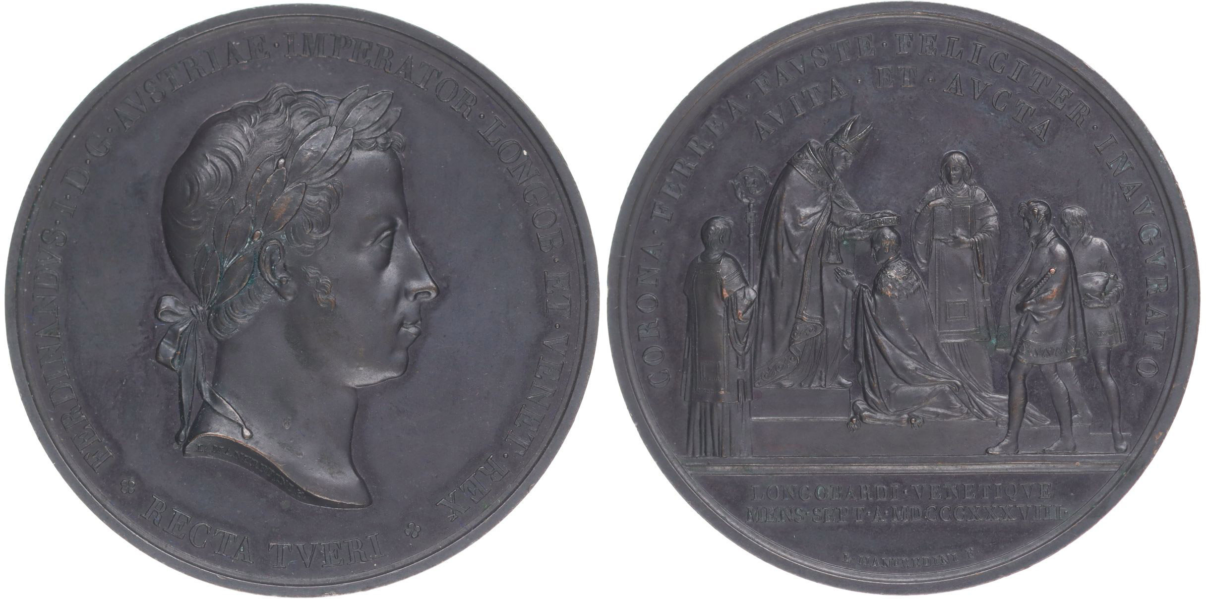 Manfredini - medaile na korunovaci v Miláně 1838#Br Portrét zprava, opis / korunovační scéna, nápis, opis Sign., Bronz 52 mm, 63,34 g, Mo.2578, Nov.XVIII/G-1c, Ho.3633