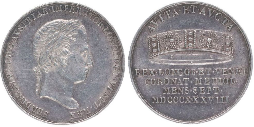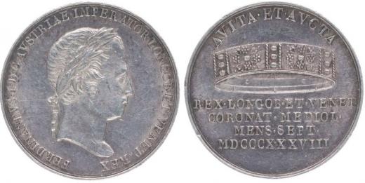 Větší peníz na korunovaci v Miláně, 6.září 1838 Portrét, opis / lombardská koruna, nápis, Nesign., Nepunc., Ag 21 mm, 5.48 g, Nov.XVIII/G-8b, P.6/18, Mo.2585, Ho.3641