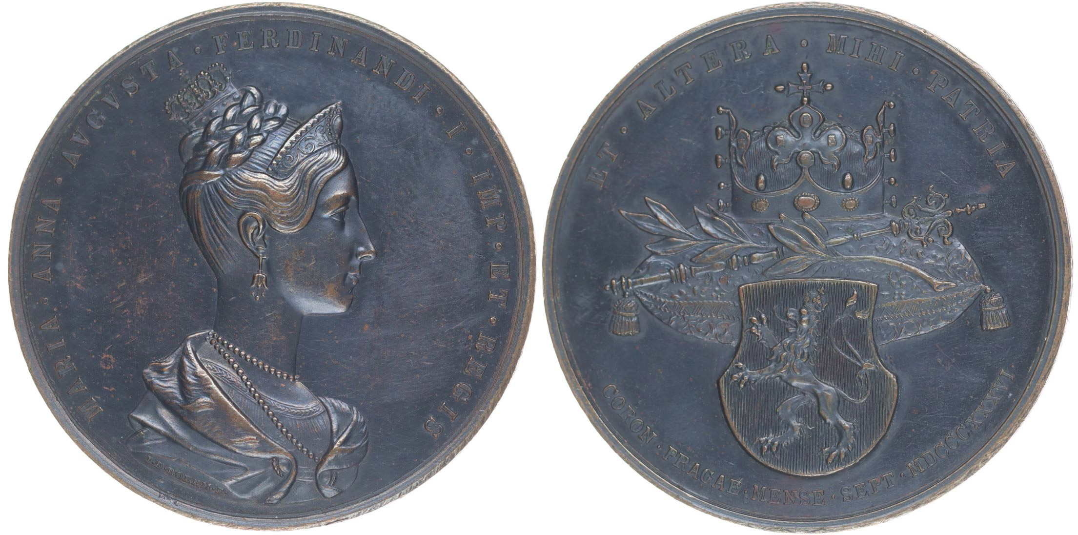 Boehm J.D. - medaile na korunovaci v Praze, 1836#Cu Korunov.poprsí zprava, opis / korunovovační klenoty na podušce, znak, opis, Cu 47 mm, 63,15 g, Nov.XVIII/H-1c, Mo.2558, ČS.1497, P.III/6