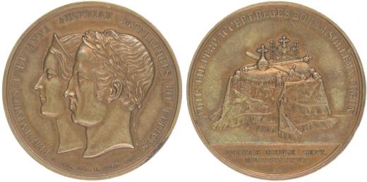 Loos a Held - medaile na korunovaci v Praze, 1836#Mos. Dvojportrét, opis / korunovační klenoty na stole, opis, Mosaz 39 mm, Sign., ČS.1498, P.III/17, Nov.XVIII/1-Id