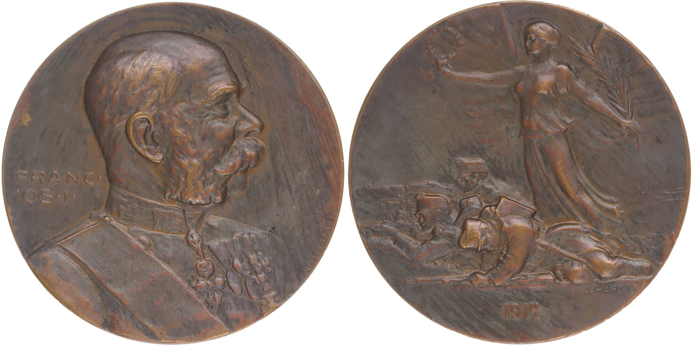 R.Neuberger a A.Hartig - Medaile na světovou válku, 1914#Bronz Poprsí zprava, opis / vojáci v boji, nad nimi Niké s věncem a palmovou ratolestí, vročení, Sign., Bronz 50 mm,54 g