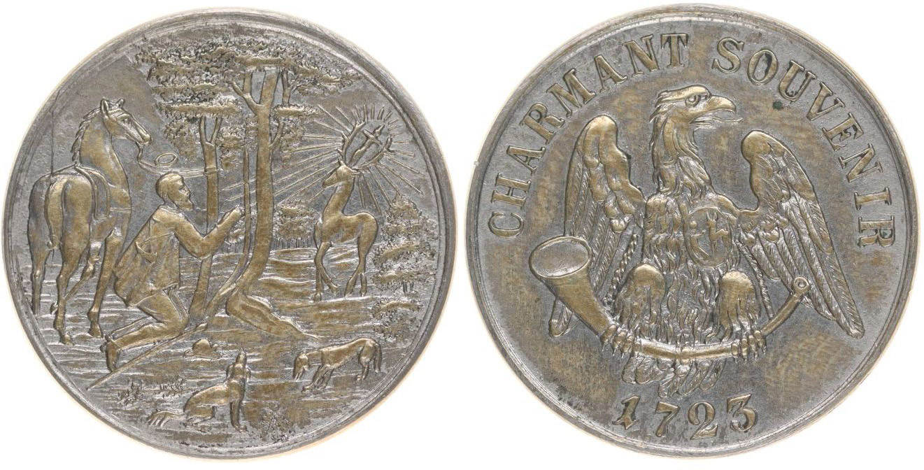 Stříbrná lovecká medaile, 1723, vidění sv.Huberta / insignie Řádu sv.Huberta, J.P.Grosskurt, Postř.mosaz 28 mm, 9,13 g_R!