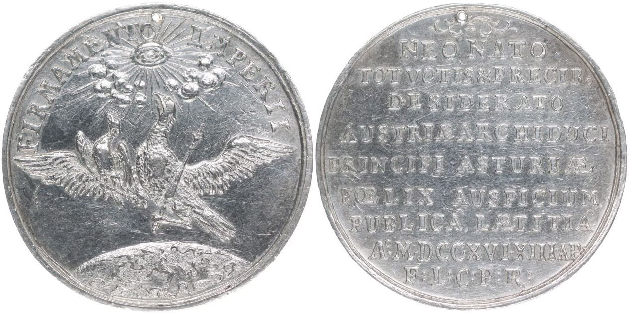 Ag žeton na narození arciv.Leopolda 1716 Orel na zeměkouli, opis / 9řádk.nápis, Ag 29 mm, Fr.2755, SJ.87 _dírka RR!