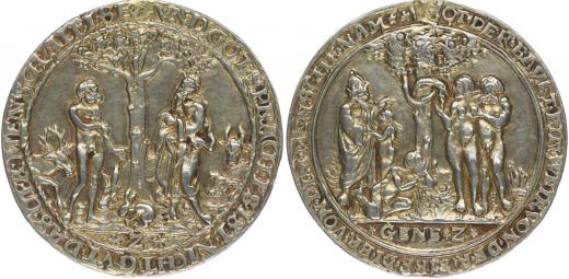 Adam před Bohem Otcem se zvířaty v ráji, opis / Adam a Eva u stromu poznání, opis, 38,5 mm, 15,485 g, Ka.128, tba.XIV/2, Enz.57