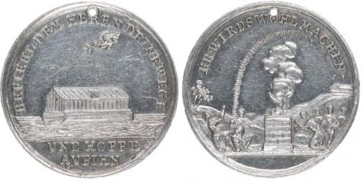 Německo - Noemova archa, 2řádk.nápis v úseči, něm.opis / hořící oltář, okolo 6 osob, něm.opis, b.l., Nesign., Ag 21 mm, 3,16 g_dírka
