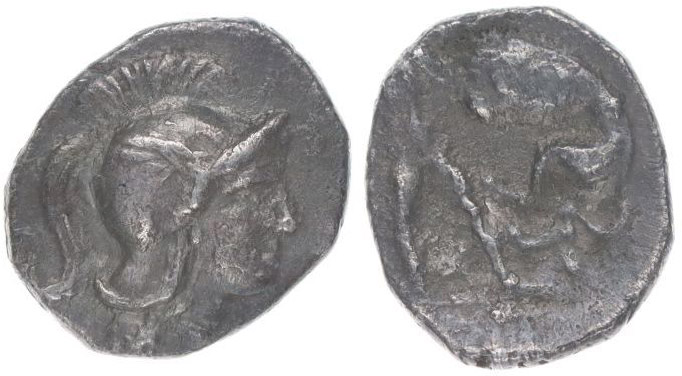AR Tritartemorion, Hlava Atény zprava / stojící Heracles zprava bojující s nemejským lvem, SG.351pod., 11 mm, 0,53 g