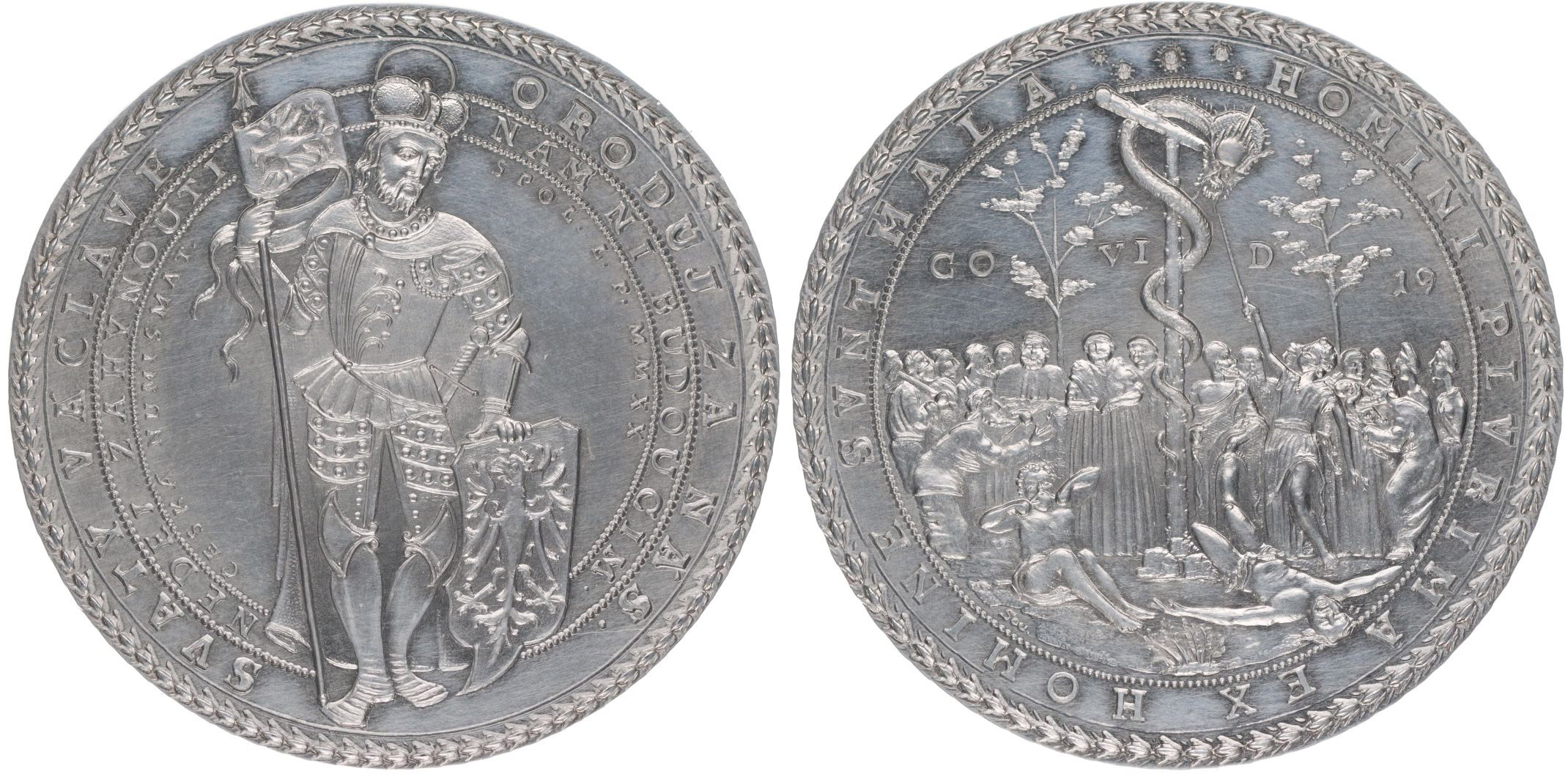 P.Soušek - morový 2 tolar Covid 19, 2020 Stojící sv.Václav s praporcem a se štítem, dvojitý opis / had na kříži skupina mužů, opis, Sign.Sou, Ag 46 mm, 58,00 g_RR!
