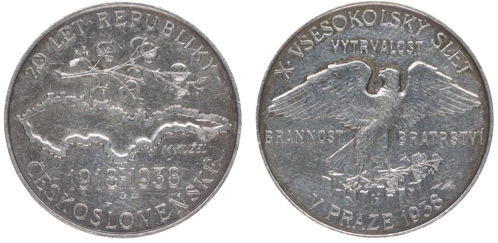 Praha - 20 let republiky, X.všesokolský slet, 1938 Mapa republiky, lipová ratolest, písmo / sedící sokol a písmo, Sign., Punc., Ag 987/1000, 35 mm, 13.42 g