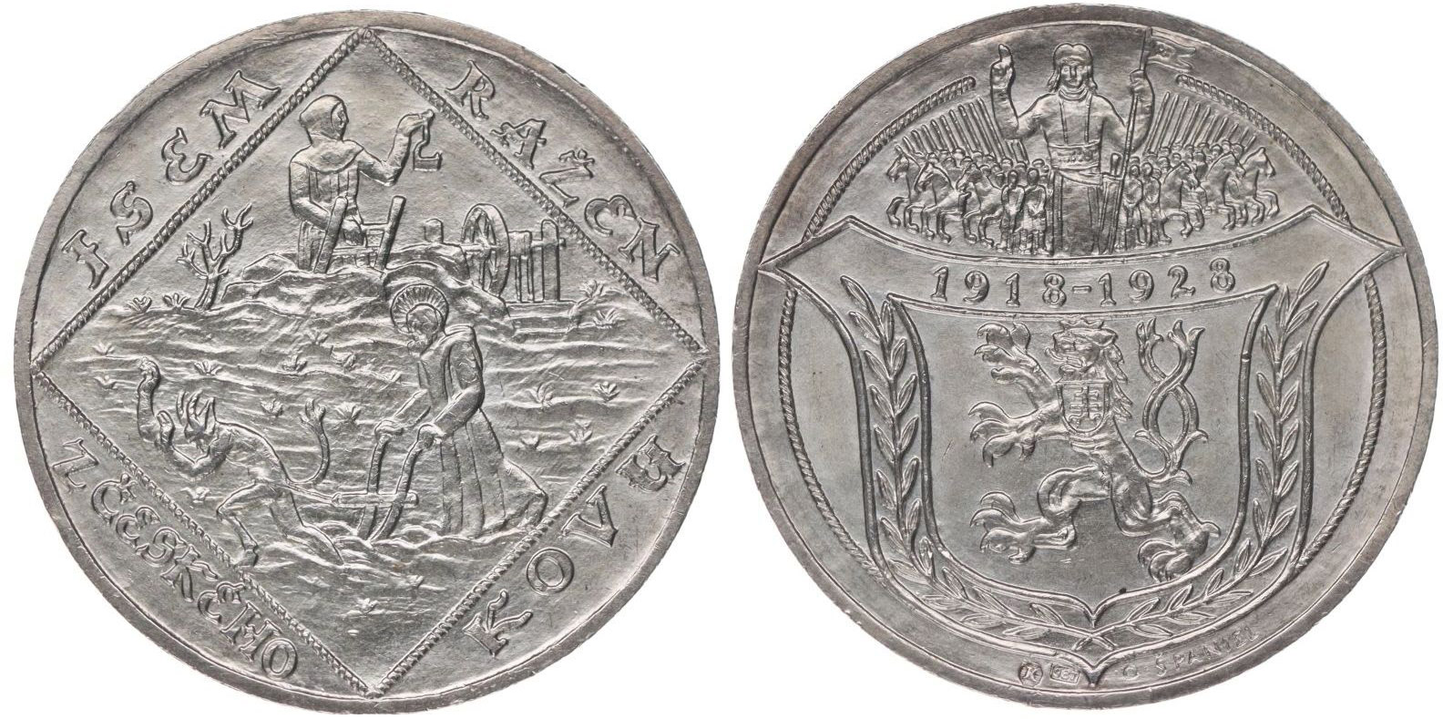 Jsem ražen z českého kovu - 10. výročí republiky 1928#Ag Sv.Prokop orá s čertem, havíř, opis / státní znak, Sv.Václav s rytíři, Sign., Punc.987, Ag 34 mm, 20,05 g