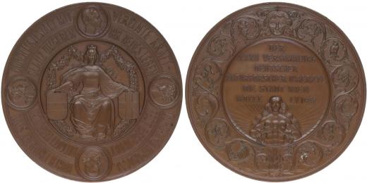 C.Radnitzky - Vídeň - 32.výstava německých přírodovědců a lékařů 1856 Sedící Austria čelně se dvěma štíty, dvojitý opis / 6řádk.nápis, po obvodu ornamenty, Haus.3318, Ho.7050, Bronz 69 mm, 120,18 g