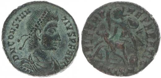 AE3, Rv:"FEL.TEMP.REPARATIO", stojící voják se zajatcem minc.Siscia, S.3910, C.47, RIC.361