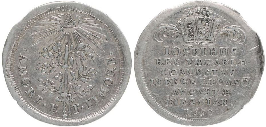 Menší peníz na korunovaci na římského krále, 26.1.1690 v Augsburgu, meč ovinutý vavřínovou ratolestí, opis / pod korunou 7řádk.nápis, Nesign., Ag 20 mm, 1.97 g, Nov.X/B-35b, Mo.1232, Ho.2422 _dr.hr.raž.