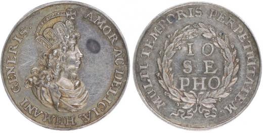 Medaile na římskou korunovaci v Augsburgu, b.l. (1690) Portrét Josefa I. zprava, opis / 3řádk.nápis IO-SE-PHO ve věnci, opis Nesign., Ag 25 mm, 5,52 g, Mo.1227, Nov.X/L-21a, LG.XV/333_RR!