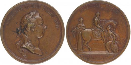 Krafft - medaile na návštěvu Sedmihradska v r. 1773#Br Poprsí zprava, opis / císař na koni před bránou města, 2řádk.nápis v úseči, Sign., Bronz 50 mm, 50,68 g, Mo.2043, LG.-, SD.249_R!