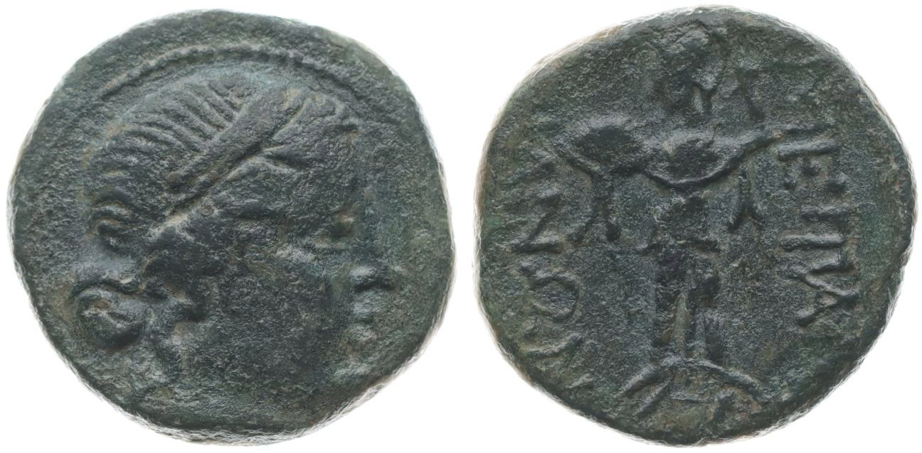 AE 20 mm, Hlava Atheny Alkidemos zprava / stojící Aténa a nápis ve svislých řádcích, SG.1676, BMC.3.8-10