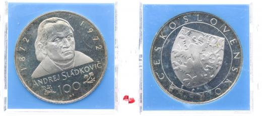 100 Kčs 1972 - Sládkovič (zkušební ražba), 39 mm, 24.9 g Sign.AP/ZK, Andrej Peter, Zdeněk Kolářský)_orig.etue s pečetí