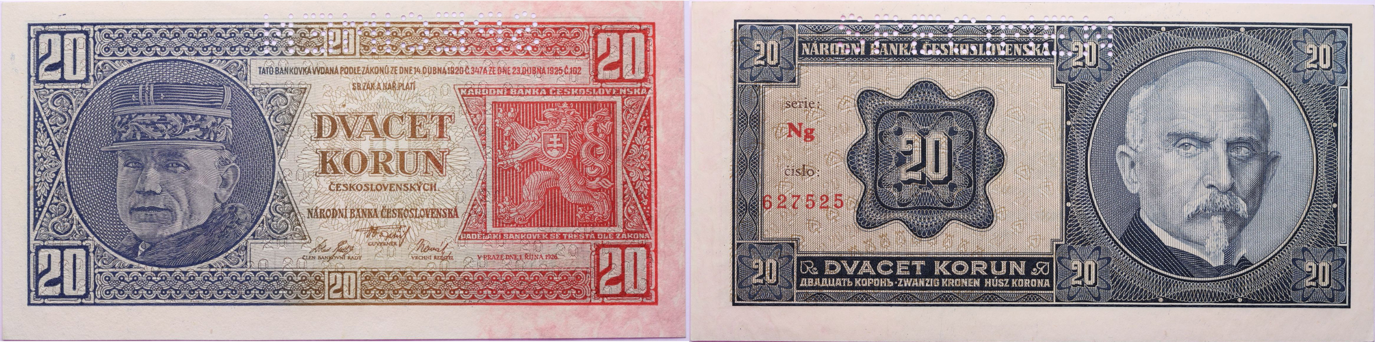 20 Kč 1926, série Ng, B.21b2, Hejz.21c2S2_"SPECIMEN" z rubu