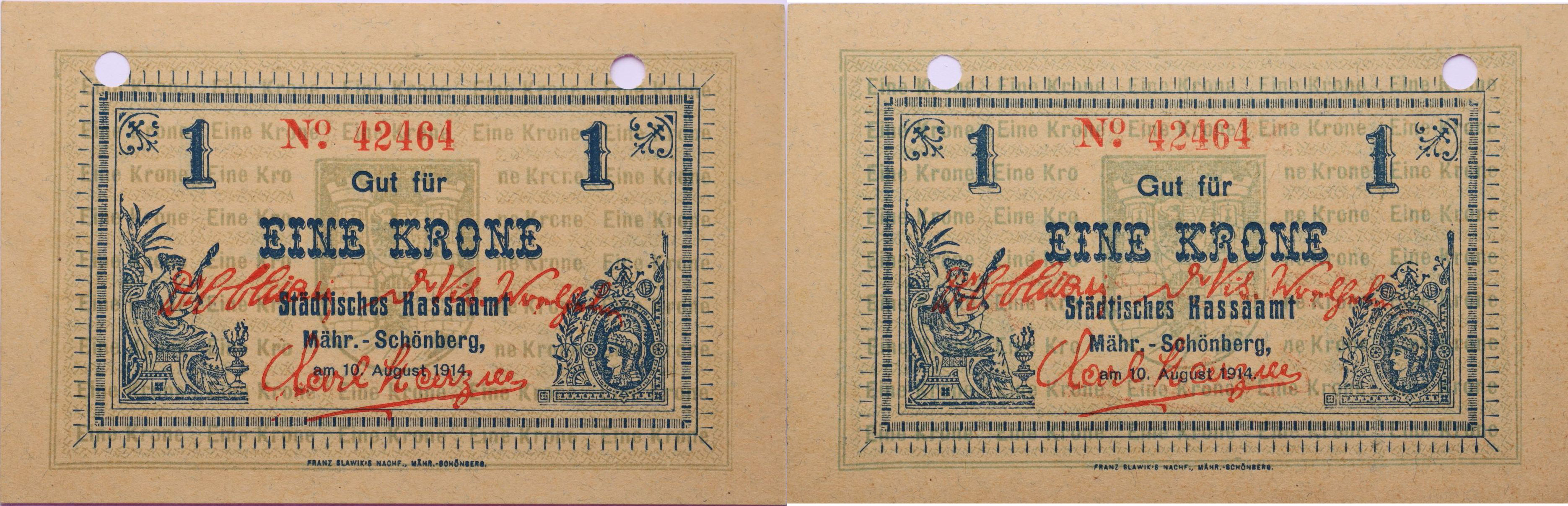 Šumperk (M.Schönberg) město, 1 Krone 10.8.1914, č.42464 DH.120.1.2b_u horního okraje perf.2x díra 5 mm