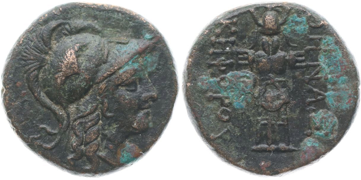 AE 19 mm, hlava Atheny s helmou zprava / stojící postava, dvojitý nápis, SG.3960, BMC.180