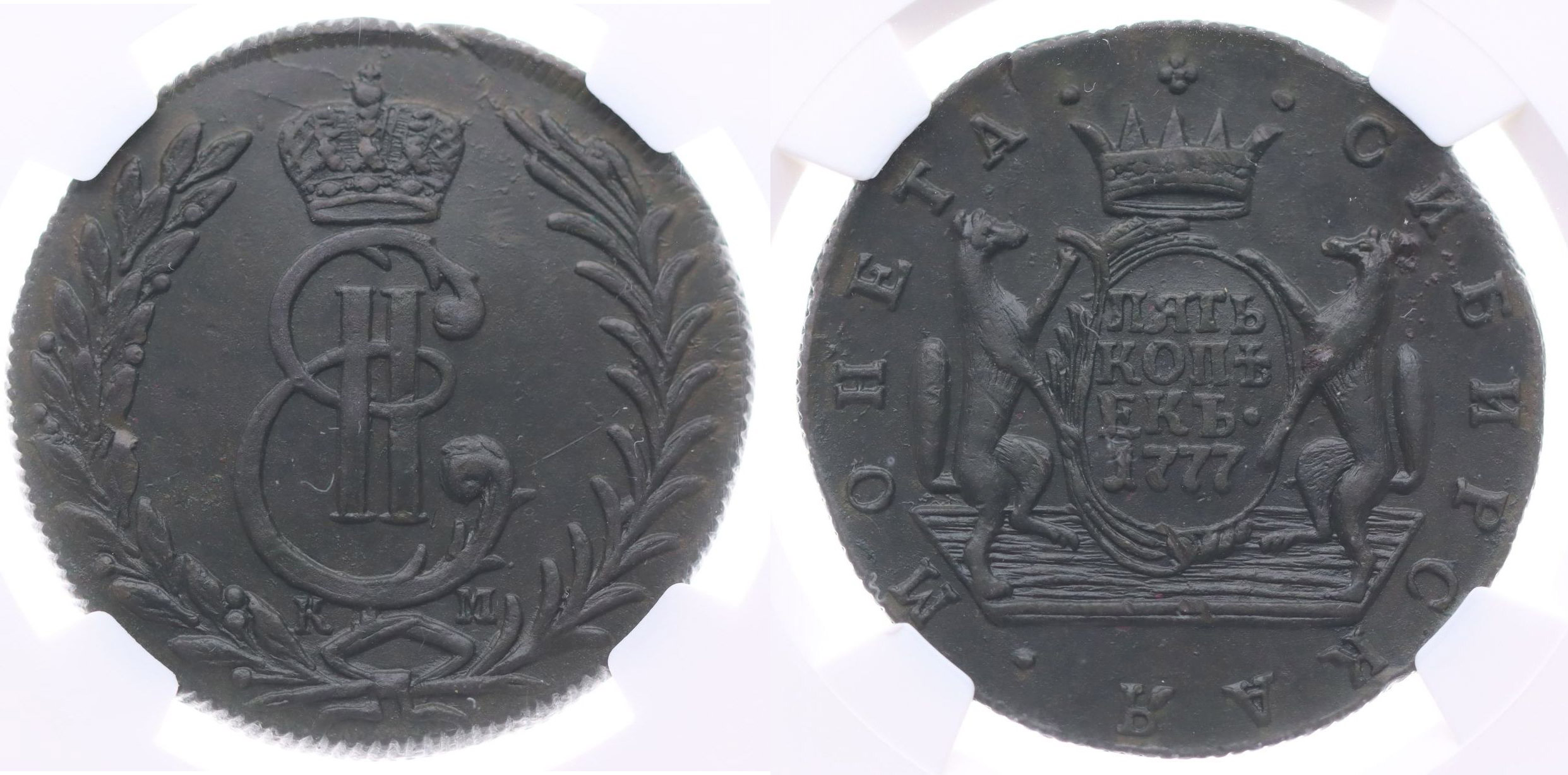 5 Kopějka 1777 KM - pro Sibiř, Kolyvan, Cr.5, Uzd.4262 skup.I-A/a _v NGC etui MS62 R!