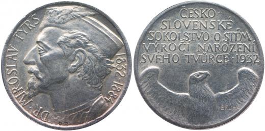 ČOS - 100.výročí narození Dr.Miroslava Tyrše, 1932#Ag Portrét v sokolské čapce zleva, opis / sokol, nápis, Sign., Punc. 987, Ag 42 mm, 30.20 g