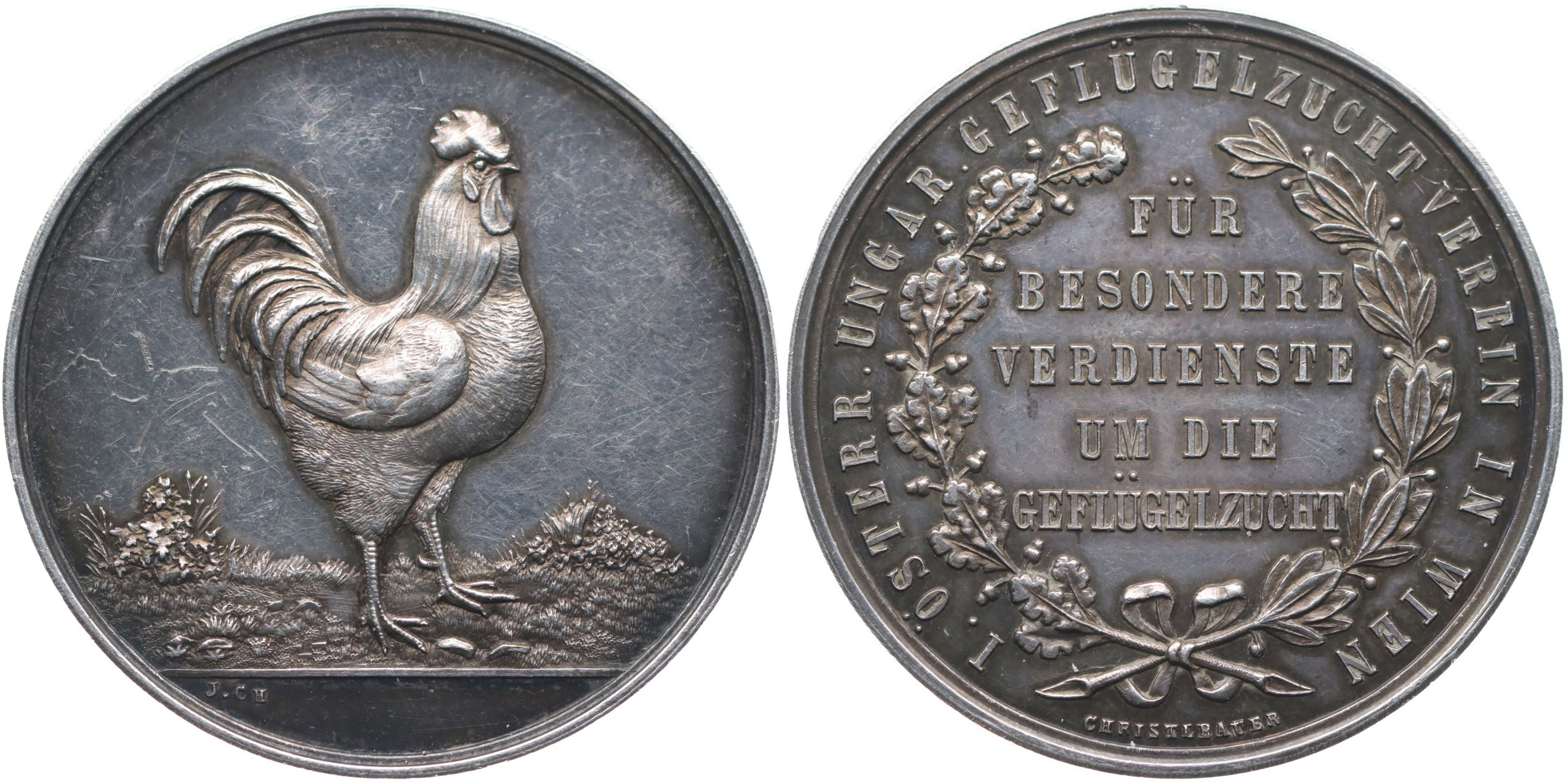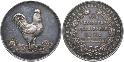 I. rakousko - uherský spolek chovatelů drobného zvířectva, b.l. Slepice zprava na trávníku / 5řádk.nápis - za zvláštní zásluhy o spolek, opis, Sign., J.CH., Punc. na hr., Ag 40 mm, 27, 08 g