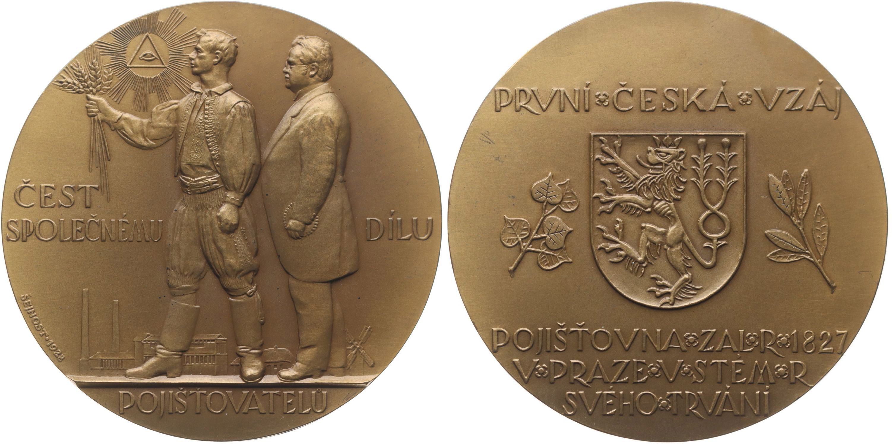 První česká vzáj.pojišťovna v Praze - 100 let trvání, 1928 Rolník a průmyslník, budovy, boží oko, nápis / znak, snítky vavřínu a lípy, nápis, Sign., Bronz 65 mm, Boh.129