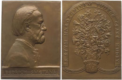 Bedřich Smetana - k stým narozeninám, 1824 - 1924 Poprsí zprava, nápis / kytice se stuhou, nápisy, Sign., Bronz. plaketa 57x76 mm