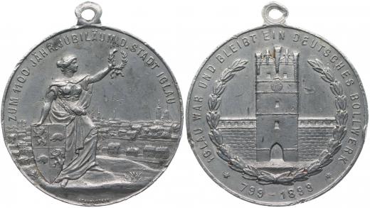 Schwerdtner - 1100.výročí založení města 799 - 1899 alegorická postava s věncem a znakem, v pozadí pohled na město, opis / městská brána, opis, Sign., Sn 40 mm_čet.hry orig.raž.o.