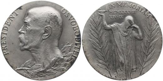 O.Španiel - úmrtní medaile, 1937 (Ag matové 60 mm) Poprsí zleva, vavřín.ratolest, opis / truchlící post. palm.ratolesti, nápis, Sign., Ag 987, 77,50 g, Fl.54b, Nov.01.135a_orig.etue