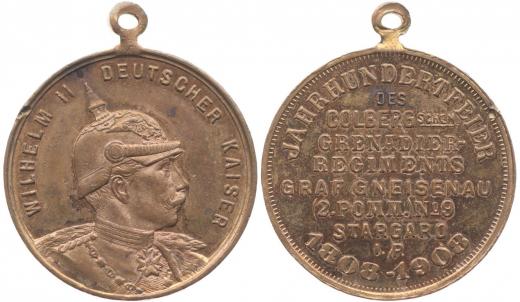 Stargard i.P. (dnes Polsko) - slavnost k 100.výročí regimentu gránátníků Goldberg č.9 hraběte Gneisanau - 1808 - 1908 Poprsí císaře, opis / 8řádk.nápis, opis, Cu 29 mm_dr.hr. orig.raž.o.