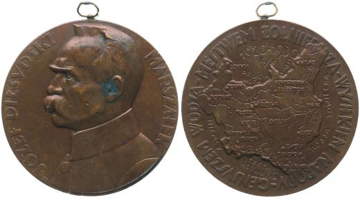 Jozef Pilsudski - marszalek - 18.10.1920 - 1930 Poprsí zleva, opis / mapa Polska, opis Bronz 55 mm, 74,50 g_ouško R!
